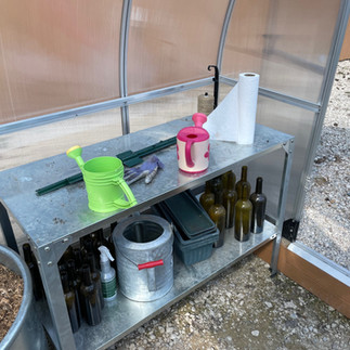In my own greenhouse, I’ve experimented with small but meaningful design choices that add up to a smoother experience. I use lightweight pots to reduce strain on shelving. The pots are sized specifically to accommodate upside-down wine bottles for passive watering when I’m away. I’ve installed animal troughs for root vegetables so I don’t have to bend down as much. A simple stool allows me to work comfortably without putting pressure on my knees.